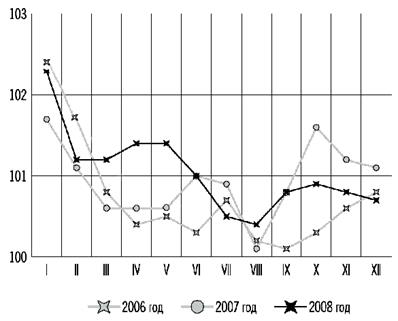 В 2008 году в основном замедление темпов роста цен произошло на рынке продовольственных товаров. Существенным образом на этот процесс оказало воздействие товаропроводящие сети, так как для ускорения денежного оборота спроса усилились стимулы торговых организаций по сдерживанию роста цен. Также сдерживанию роста цен способствовало снижение мировых цен на продовольствие, в связи с чем в условиях начавшегося сжатия платежеспособного спроса в ноябре снизились цены производителей пищевых продуктов. В итоге темп роста цен на продукты в ноябре уменьшился до 1,3%, тогда как в октябре он повысился до 1,6%. (Рис.2.4)