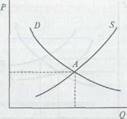 Механизм спроса и предложения. Если государство не вмешивается в рыночный механизм, т.е. не вводит контроль за ценами, то спрос и предложение на конкурентном рынке придут в равновесие и установятся рыночная цена товара и его общий объем производства. Равновесие возникает при таких ценах и при таких количествах товаров, при которых конкурентные силы сбалансированы, т. е. когда количество товаров, которое хотят купить покупатели, соответствует количеству товаров, которое продавцы хотят продать. В результате образуется равновесная цена — цена такого уровня, когда объем предложения соответствует объему спроса. Графическое изображение равновесной цены представлено на рис. 3.3, где точка пересечения кривой спроса (D) и кривой предложения (S) — А — равновесная цена.