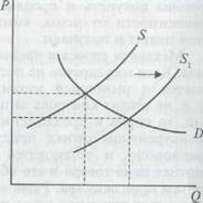 • рост предложения товара вызывает уменьшение равновесной цены и увеличение равновесного количества товара;