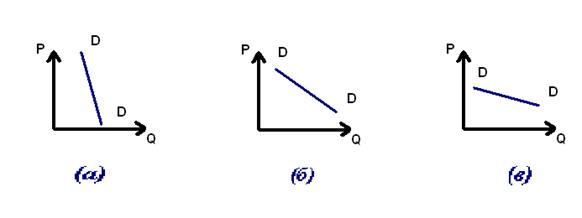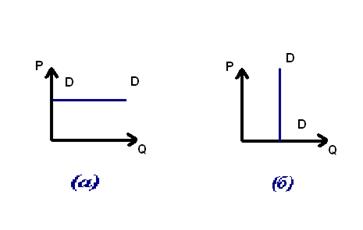 Существует два крайних случая. Первый случай — существование только одной цены, при которой товар будет приобретаться покупателями. Любое изменение цены приведет либо к полному отказу от приобретения данного товара (если цена повысится), либо к неограниченному увеличению спроса (если цена снизится). При этом спрос является абсолютно эластичным, показатель эластичности бесконечен. Графически этот случай можно изобразить в виде прямой, параллельной горизонтальной оси (рис. 3, а