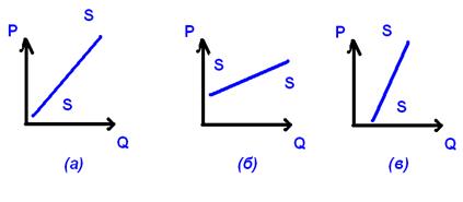 Ценовая эластичность предложения выступает как прямая линейная зависимость между экономическими переменными, показывающими процентное изменение цен и объема предлагаемых к продаже товаров. Эти зависимости обусловливают положение кривых эластичности предложения, изображенных на графике (рис. 5).