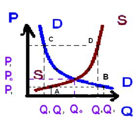 (точка B на графике), тогда как продавцам выгодно поставить товара лишь в количестве Q2