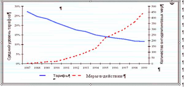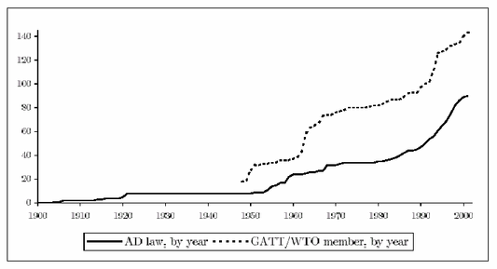 Этого "неформального" давления вполне достаточно, чтобы сделать связь между расширением ВТО и принятием антидемпинговых законов достаточно значимой (Рисунок 2). Вполне вероятно, что большое количество стран, которые имеют антидемпинговые законы, но не применяют их, приняли их формально, "для ВТО". Склонность ВТО к рекомендациям по принятию антидемпинговых законов может быть объяснена письмом США в ВТО, где говорится, что антидемпинговые законы "помогают правительствам в их стремлении к продолжению либерализации торговли, предоставляя поддержку национальной промышленности, которая страдает от иностранных фирм, использующих нечестные торговые практики, даже в условиях либерализации внешней торговли. С этой точки зрения, антидемпинговые правила критически важны для получения и сохранения необходимой общественной поддержки общей многосторонней цели торговой либерализации... Хотя антидемпинговые правила содержат средства защиты против наносящего вред демпинга, это не потому, что эти практики ценообразования, т.е. демпинговые практики, антиконкурентны в антимонопольном смысле. Антидемпинговые правила обеспечивают защиту от наносящего вред демпинга в качестве косвенного ответа на нерыночную политику иностранных государств или различия в национальных экономических системах[14]