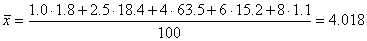 Для решения задачи, прежде всего, необходимо найти середины интервалов. Определенная трудность возникает в связи с тем, что первый и последний интервалы являются открытыми. Нижнюю границу первого интервала естественно принять равной нулю. Тогда середина этого интервала равна (0+2)/2=l. Для нахождения центрального значения последнего интервала применим предложенный выше прием. Величина интервала, предшествующего последнему, равна 2. Условно принимаем за величину последнего интервала 2. Тогда верхняя граница того интервала-9 и, следовательно, его середина вычисляется так: (7+9)/2=8.