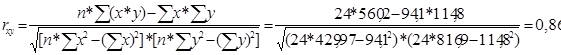 =0,86≤ 1, то это показывает прямую связь между среднегодовой стоимостью ОФ и товарной продукцией, т.е. увеличение X влечет за собой увеличение Y, причем близость коэффициента корреляции к 1 говорит о стремлении к функциональной зависимости, когда каждому значению факторного признака строго соответствует значение результата признака.