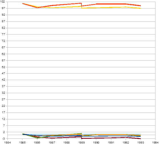 В 1986 — 1987, 1989 и 1993 гг. наблюдается снижение ввода жилой площади, пик которого приходится на 1989 г.