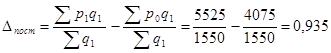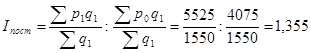 - индекс цен постоянного состава показывает, что цена литра молока увеличилась на 35,5 % или на 0,935 руб. за счёт изменения цен на каждом рынке.