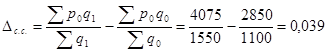 - индекс влияния изменения структуры объема продаж молока на динамику сред ней цены показывает, что цена литра молока увеличилась на 1,5 % или на 0,039 руб. за счёт изменения товарооборота на отдельных рынках.