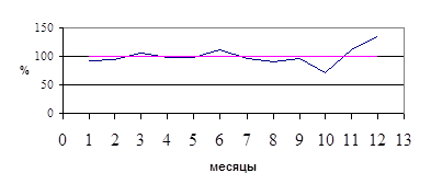 По колонке 6 построим графическое изображение – сезонную волну.Сезонная волна реализация кондитерских изделий в торговой фирме «Сластена» по месяцам внутри года, %.