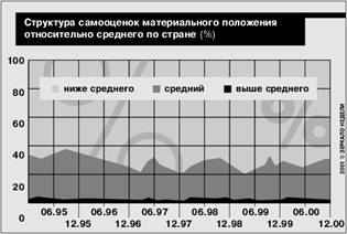 Бросается в глаза и отсутствие в стране «среднего класса», являющегося основным компонентом социальной стабильности и прогресса. Представители целого ряда профессиональных групп (врачи, учителя, ученые, инженеры), которые еще в начале переходного периода имели средние по национальным стандартам доходы и играли стабилизирующую роль в обществе, ныне в большинстве своем оказались среди «новых бедных». А ведь переход значительной части людей с высоким уровнем образования и высокими социальными ориентирами в ту группу, доходы которой ниже (либо едва выше) черты бедности, чреват серьезными осложнениями. В силу своего высокого интеллектуального уровня такие люди оказывают существенное (хотя и не всегда очевидное) воздействие на общественную психологию, и их неудовлетворенность характером социально-экономического развития, неизбежная в условиях резкого падения личного уровня жизни и социального статуса, неминуемо сказывается на социальной ситуации.
