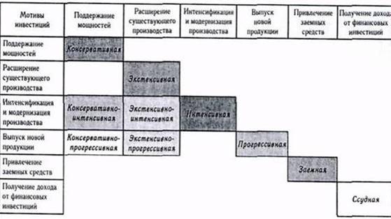 Существуют множество вариантов инвестиционных стратегий на уровне предприятия. Инвестиционная стратегия (или инвестиционно-финансовая стратегия) отличается для предприятий из разных стран, отраслей, различных форм собственности, территориального расположения, вида продукции, технологического уровня и т.д. [21, 234]
