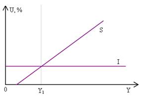 На малюнку 4.2 представлена крива, що зв'язує рівень безробіття U (у відсотках) з рівнем національного доходу Y (у доларах). По Кейнсу рівноважний рівень національного доходу Y1, тобто макроекономічна рівновага, відповідає умові рівності інвестицій I заощадженням S. При цьому повна зайнятість може і не досягатися, або тому, що «фірми» не мають необхідних стимулів для достатніх інвестицій у виробництво, що забезпечує повну зайнятість.