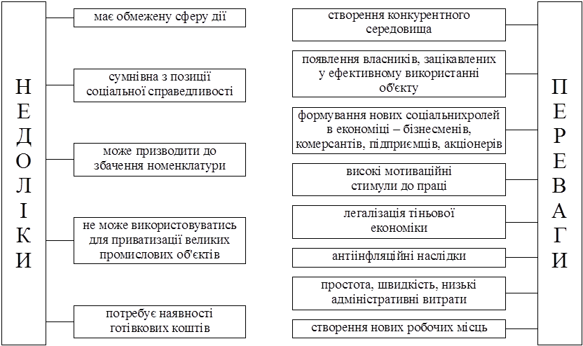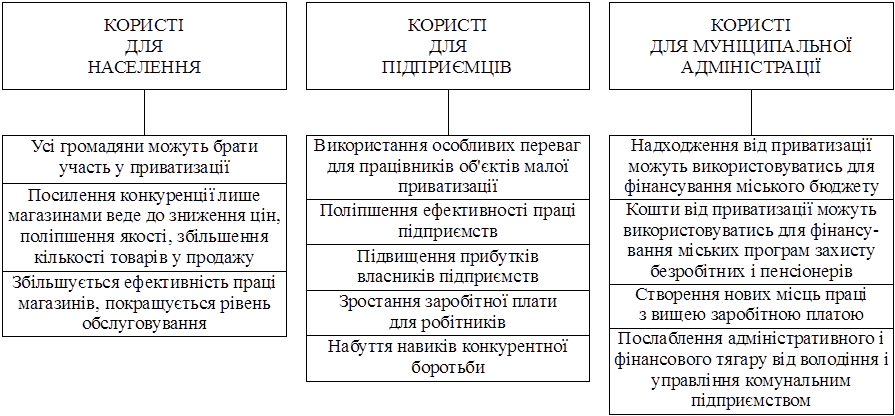 Вона має безумовні користі для всього населення, яке може прийняти безпосередню участь у малій приватизації. Перехід невеликих підприємств до нових власників веде до посилення конкуренції між ними, що викликає зниження цін, поліпшення якості товарів та послуг, збільшенню кількості товарів та їх асортименту у продажу. Внаслідок цього зростає ефективність праці магазинів, покращується рівень обслуговування всього населення.