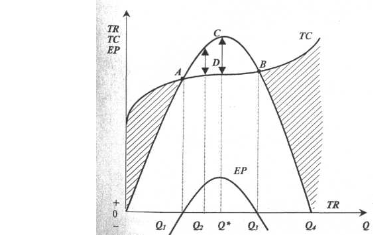 Коли обсяг виробництва становить Q*, прибуток ЕР максимальний, бо відстань між TR і ТС (довжина відрізка DC) є найбільшою. Зауважимо, що нахили обох кривих — ТС і TR — відповідно у точках D і C однакові (дотичні до цих точок паралельні між собою).