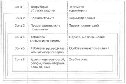 Принцип эшелонирования заключается в создании нескольких последовательных рубежей защиты (зон безопасности) таким образом, чтобы наиболее важная зона безопасности объекта находилась внутри других зон (рис. 2). При этом, во-первых,