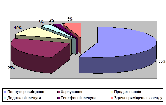 3. Введені в експлуатацію високо комфортабельні готелі в Києві за участю іноземних компаній дозволили істотно скоротити дефіцит готелів високого класу для багатої клієнтури (в основному напрями ділового туризму). Вартість розміщення в цих готелях порівнянна з вартістю розміщення в найбільших столицях миру. Не дивлячись на це, заповнюваність готелів «люкс» залишається на достатньо високому рівні.