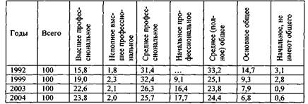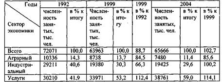 В 1999–2004 гг. произошел некоторый рост численности занятых в экономике страны (2,7%). Однако по-прежнему сокращалась занятость в аграрном секторе. В индустриальном секторе она немного выросла, но её доля в общей численности занятых продолжала уменьшаться. Заметный рост наблюдается только в сфере услуг (14,1%). Все эти изменения свидетельствуют о продолжении тенденции принципиальной трансформации структуры занятости населения в экономике страны.