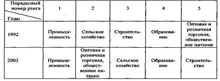 Таблица 10. Положение в ранжированном ряде первых пяти отраслей экономики в 1992 и 2003 годах