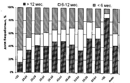 Рис. 4. Распределение возрастных групп безработных по продолжительности поиска работы (Российская Федерация, 2002 г.)