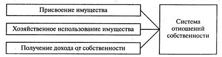 Система экономических отношений собственности включает следующие элементы: а) присвоение факторов и результатов производства; б) хозяйственное использование материальных и иных средств и в) получение дохода от собственности (рис. 2.1).