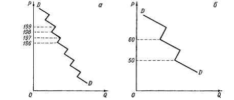 Представления продавцов об эластичности спроса на продаваемые ими товары могут оказаться весьма своеобразными, что скажется и на их ценовой стратегии. Многие из них полагают, что кривая спроса имеет зубцы, это делает ее похожей на пилу (рис.3.4), так что характер зависимости объема спроса при движении вдоль кривой постоянно меняется. Некоторые из них полагают, что покупателей больше привлекают цены, выраженные нечетными числами. Как видно на рис.3.4а, объем спроса при цене 197 больше, чем при ценах 196 или 198 руб. Другие считают, что объем спроса при ценах, выраженных круглыми цифрами, меньше, чем при любой другой цене в пределах определенного интервала (рис3.4б). Существуют и другие представления о характере функций спроса и его эластичности, которые служат психологической основой для других стратегий ценообразования.