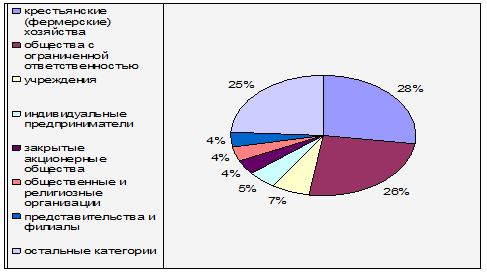 Наибольший удельный вес среди предприятий занимают крестьянские (фермерские) хозяйства – 28%; общества с ограниченной ответственностью –26%; учреждения – 7%; индивидуальные предприниматели – 5%; закрытые акционерные общества, общественные и религиозные организации, представительства и филиалы – по 4%; остальные категории – менее 25%.