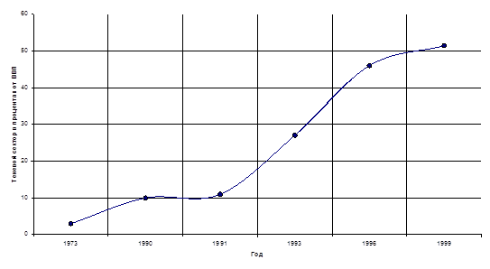 В России в первое десятилетие реформ (1985-1995 гг.) доля теневой экономики по разным оценкам составляла от 25 до 45% национального продукта, тем или иным способом в ней участвовало около 60 млн. человек, т.е. более половины совокупной рабочей силы страны. Таким образом, теневая экономика в России по размерам резко превышала среднемировой уровень.