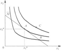 Поскольку на более высоких кривых безразличия должны размещаться планы потребления, которым отдается предпочтение перед находящимися на более низких кривых, целевая установка потребителя состоит в том, чтобы достичь наивысшей из достижимых кривых безразличия,