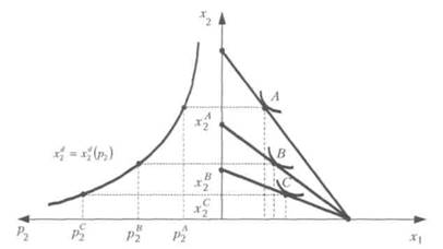 привело к повороту вниз бюджетной линии и переходу индивидуума на более низкую кривую безразличия и соответственно к выбору новых оптимальных планов. Отложив значение цены блага х2