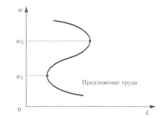 Варьируя ставку заработной платы, можно исследовать взаимосвязь между ее величиной и предложением труда, т.е. объемом времени, который индивидуум согласен пожертвовать в пользу потребления. Теоретическое моделирование и эмпирические исследования показали, что предложение труда домохозяйства неоднозначно зависит от ставки заработной платы: при определенных значениях w