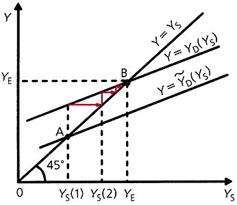 Сначала спрос характеризовался прямой Y = YD, и система находилась в состоянии равновесия A. Затем спрос вырос (прямая Y = YD), и в результате итерационного процесса (соответствующие переходы показаны цветом) система перешла в новое состояние равновесия B.