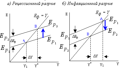 Если фактический равновесный ВВП меньше потенциального, то в экономике имеет место так называемый рецессионный разрыв. Такая ситуация, в соответствии с кейнсианскими представлениями, обусловлена недостаточностью совокупных расходов для обеспечения уровня выпуска полной занятости, поэтому для достижения этого уровня выпуска (Y*) необходимо увеличить совокупные планируемые расходы Ep. (рис.2.(а)). Исходное равновесие находится в точке А, в которой величина совокупных планируемых расходов равна Е1, а объем равновесного фактического выпуска Y1, что он меньше, чем уровень выпуска полной занятости Y*. Чтобы обеспечить выпуск Y*, должны увеличиться планируемые расходы, т.е. кривая Ер1 должна сдвинуться до Ер2. Важно различать рецессионный разрыв расходов и рецессионный разрыв выпуска (ВВП). Разница между величиной планируемых расходов Ер1 и Ер2 представляет собой рецессионный разрыв расходов (DЕр), а разница между величиной Y1 и Y* (DY) - это рецессионный разныв выпуска. Следует отметить, что возможность рецессионного разрыва выпуска признают представители всех направлений макроэкономистов, а рецессионный разрыв расходов имеет место только в кейнсианской модели (поскольку только в этой модели, во-первых, рецессионный разрыв выпуска объясняется недостаточностью величины совокупных расходов (совокупного спроса) в результате неполной занятости ресурсов и, во-вторых, обосновывается мультипликативный эффект воздействия изменения расходов на изменение величины совокупного выпуска). В кейнсианской модели рецессионный разрыв выпуска – это рецессионный разрыв расходов, умноженный на мультипликатор расходов (DY = DЕр х КА ), а поскольку мультипликатор расходов КА, равный [1 / (1 – мрс (1 – t))] всегда больше 1, то рецессионный разрыв выпуска всегда больше рецессионный разрыва расходов. Противоположная ситуация, при которой фактический равновесный выпуск Y превышает выпуск полной занятости (потенциальный ВВП) Y*, т.е. Yфакт >Y*, известна как инфляционный разрыв выпуска, что в кейнсианской модели является следствием инфляционного разрыва расходов, т.е. избыточности совокупных расходов. Для возвращения к потенциальному объему выпуска необходимо сократить совокупные планируемые расходы. Эта ситуация представлена на рис.2(б). Инфляционный разрыв выпуска равен DY, а инфляционный разрыв расходов равен D Ер, причем DY – это мультиплицированная величина D Ер. Чтобы ликвидировать инфляционный разрыв, планируемые расходы должны быть уменьшены на D Ер, что соответствует сдвигу кривой планируемых расходов от Ер1 до Ер2.[[2]