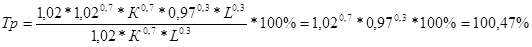 Определить темп роста экономики, используя модель Мида, которая описывается уравнением У=1,02К0,7L0,3, если известно, что объем капитала в стране вырос на 2%, а объем используемого труда сократился на 3%.