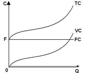 Переменные издержки меняются в прямой зависимости от объема производства. Они связаны с затратами на покупку сырья и рабочей силы. Динамика переменных издержек неравномерна (рис. 1.1.): начиная с нуля, по мере роста производства они первоначально растут очень быстро; затем, по мере дальнейшего увеличения объемов производства, начинает складываться фактор экономии на массовом производстве, и рост переменных издержек становится уже более медленным, чем увеличение продукции. Но если вступит в действие закон убывающей производительности, переменные издержки снова начинают обгонять рост производства.