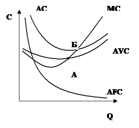 С момента пересечения кривой предельных издержек и кривой переменных издержек (точка А) средние переменные издержки начинают возрастать. Такая же закономерность существует для кривых предельных и средних валовых издержек: кривая предельных издержек пересекает кривую средних валовых издержек в точке с их минимальным значением (точка Б).