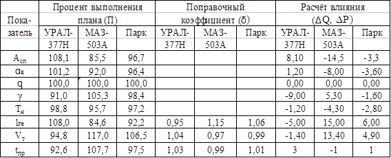 Таблица 15 Анализ влияния технико-эксплуатационных показателей на себестоимость в целом по парку