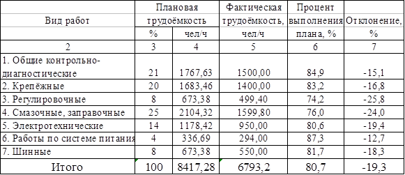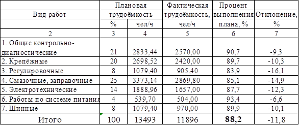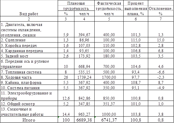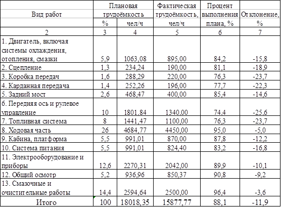 Общая фактическая трудоёмкость ремонтных работ по парку снижена на 11,9% или на 2140,58чел/ч. Наибольшее снижение трудоёмкости против плановой составило на ремонте передней оси и рулевого управления – 25,6