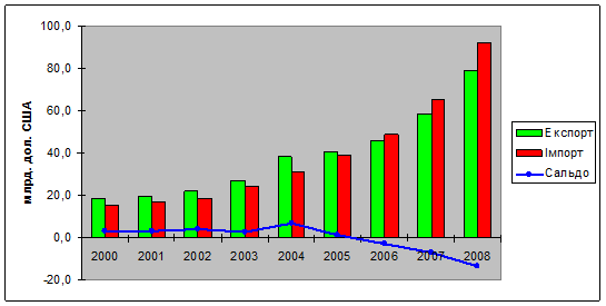 Рис.3. Торгові операції України в період з 2000 року по 2008 рік