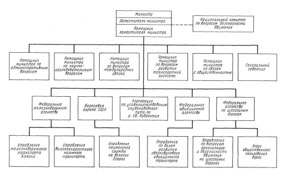 До образования единого министерства в США вопросами транспорта прямо или косвенно занимались более 30 различных федеральных управлений и других административных органов. Созданное Министерство транспорта выполняет хотя и ограниченные, но достаточно ответственные функции: координация правительственных программ по развитию транспорта, выработка единой транспортной политики, руководящее участие в разработке новых технических средств транспорта, усиление комплексности в развитии крупнейших транспортных узлов, контроль за соблюдением правил безопасности движения, организация наиболее важных научно-исследовательских и опытно-конструкторских работ. В то же время Министерство транспорта США по существу не вмешивается в эксплуатационную работу видов транспорта и частных компаний.