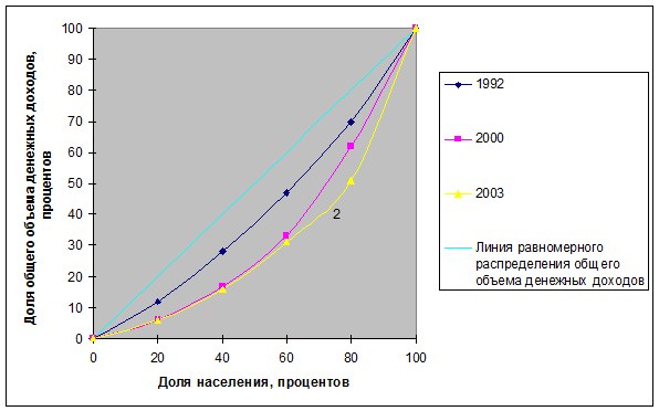 Построим кривую Лоренца (приложение 1), которая иллюстрирует усиление неравномерности в распределении общего объема денежных доходов. Так, наиболее обеспеченная группа населения сконцентрирована в 2003 г. 46,1% против 45,8 % в 2002 г., а доля наименее обеспеченной группы в общем доходе оставалась прежней на протяжении с 2001 по 2003 года, и составила 5,6 %.