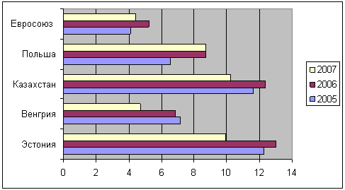 Диаграмма 1. Рост ВВП на душу населения в Казахстане и странах Европы, 2005-2007гг. (в процентах)