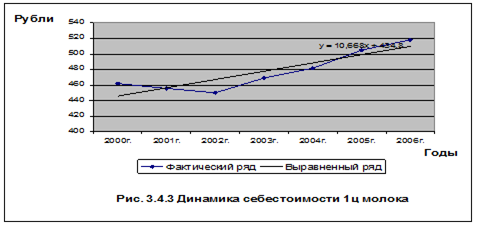 При выравнивании динамического ряда полученное уравнение показывает, что ежегодно себестоимость 1 ц молока увеличивается на 10,668 руб. 55