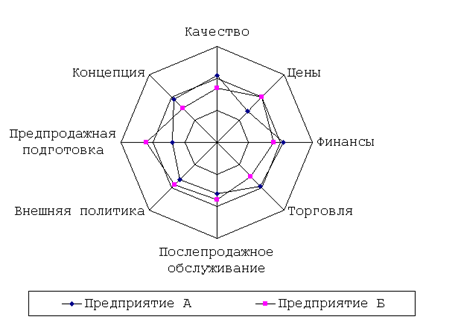 Если подойти одинаково к оценке конкурентных возможностей ряда фирм, накладывая схемы друг на друга, то, по мнению авторов, можно увидеть слабые и сильные стороны одного предприятия по отношению к другому (на рис. 1 - предприятия А и Б).