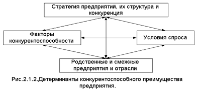 Но, пожалуй, наиболее фундаментальное исследование факторов конкурентоспособности предприятий было приведено в работах М. Портера. При этом факторы конкурентоспособности понимаются им как одна из четырех основных детерминант конкурентного преимущества наряду со стратегией фирм, их структурой и конкурентами, условиями спроса и наличием родственных или смежных отраслей и предприятий, конкурентоспособных на мировом рынке.
