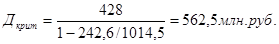 Показатель точки безубыточности будет равен 875 млн. руб. Запас финансовой прочности составит 44,6 %. Критическая величина дохода от реализации - 562,5 млн. руб.