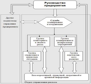 Функцию управления риском на предприятии наиболее целесообразно осуществлять с помощью специализированного подразделения или специальной подсистемы в системе управления предприятием, которая бы органично вписывалась в совокупность традиционно самостоятельных функциональных подсистем предприятия.
