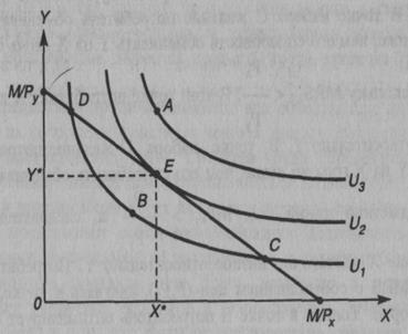 , находящейся выше бюджетной линии. Наборы, подобные D, В, С, доступны, но они также не выбираются, поскольку в наличии имеется более предпочтительный набор Е, лежащий на более высоко расположенной кривой U2