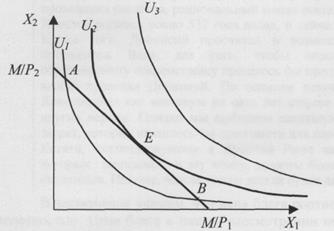 . Заметим, что максимизирующий полезность набор Е совпадает с точкой касания с наиболее высоко расположенной кривой безразличия U2