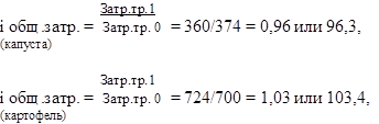 Вывод: Валовой сбор капусты в отчетном периоде составил 54545 ц., что на 115455 ц. меньше чем в базисном (170000-54545). Это произошло в результате снижения общих затрат труда на 14 тыс.чел-час и роста затрат труда на 1ц. (4,4 чел-час).