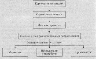 Для более низких уровней стратегия верхнего уровня превращается в цель, хотя на верхнем уровне она является средством. Так, стратегия поведения на рынке, разработанная для фирмы в целом, для службы маркетинга выступает в качестве целей и должна быть реализована соответствующей функциональной стратегией.